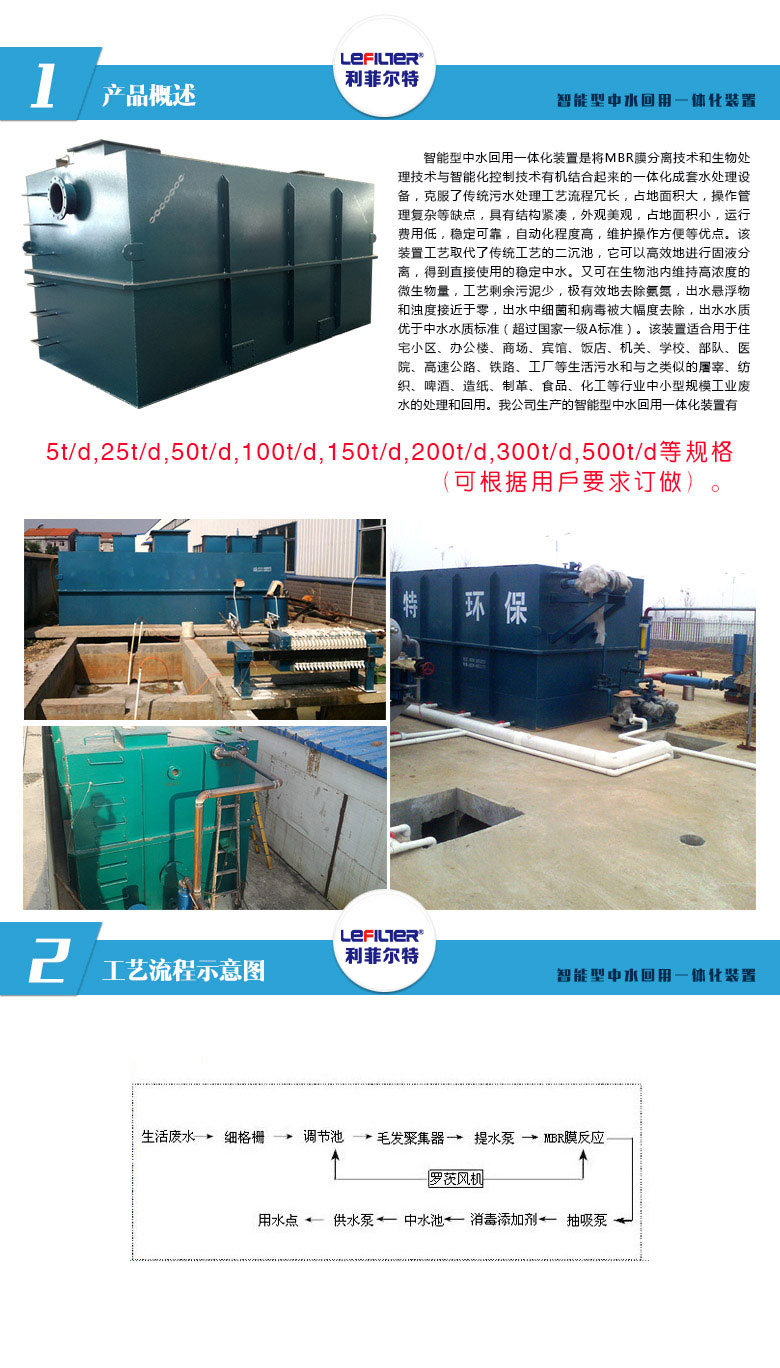 智能型中水回用一體化裝置是將MBR膜分離技術和生物處理技術與智能化控制技術結合起來的一體化成套水處理設備。克服了傳統污水處理工藝流程冗長,占地面積。擻延玫,穩定可靠,自動化程度高,維護操作方便等特點。