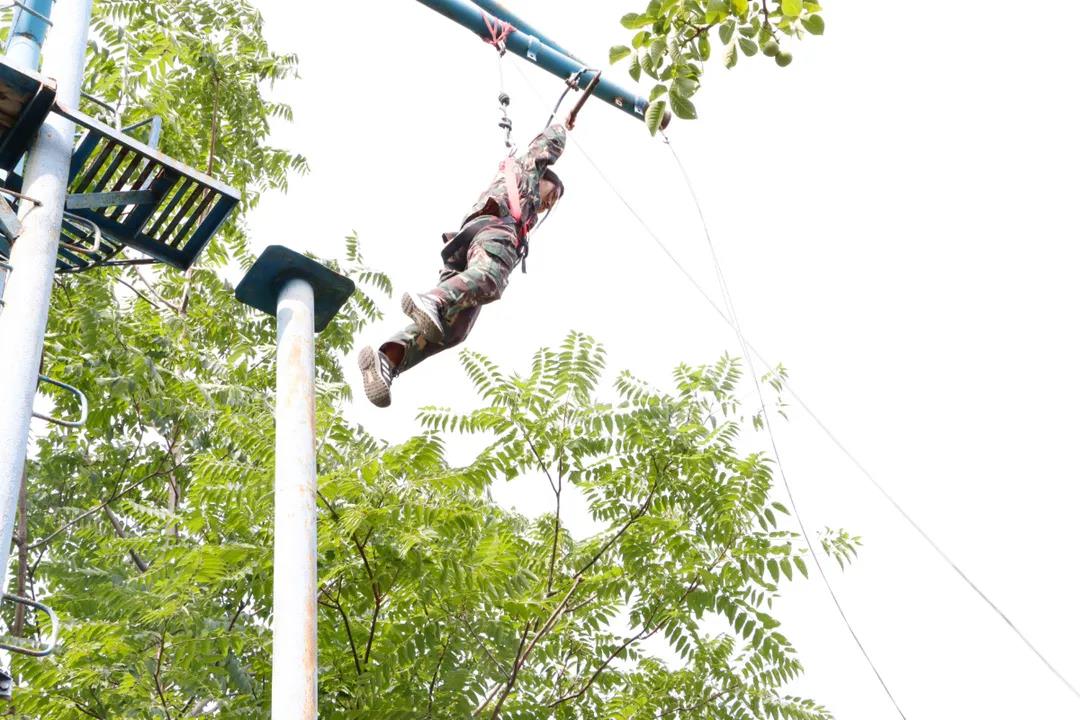 在教練的指導下,先后進行了“信任背摔”、“盲人方陣”、“高空斷橋”、“畢業墻”等訓練項目,其中壓軸的“畢業墻”項目將本次拓訓推向了高潮,在不借用任何外力和道具的情況下,70名新戰友依靠團隊協作的力量僅僅耗時13分08秒,徒手攀登4.2米高墻全員通關,挑戰成功!