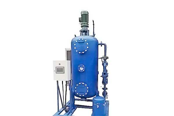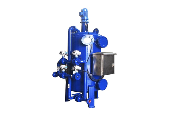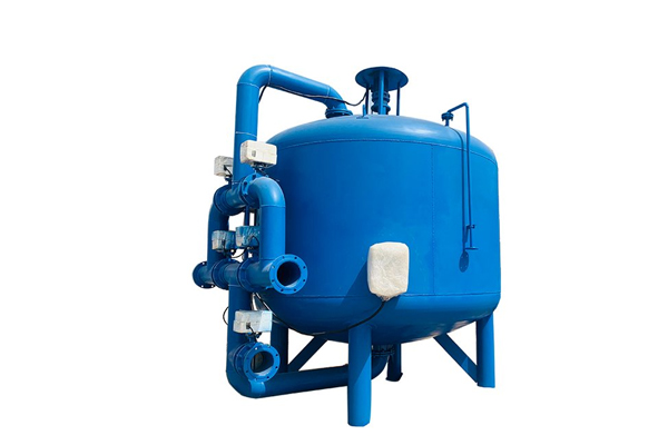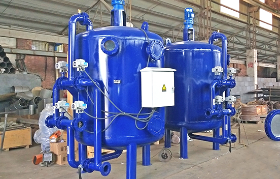 反洗狀態: 隨著雜質在填料層中不斷聚積, 內部壓頭損失將不斷增大。當進、出水壓頭損失達到設定值時,系統將自動激活定壓差裝置使其轉換至反洗狀態,電機帶動攪拌器在罐體內轉動,更便于清洗聚積起來的雜質。當系統處于反洗狀態時,水的流向由底部向上流動,電機帶動攪拌器充分清洗濾料,由排污口直接流出。反洗后系統回復正常過濾狀態.
